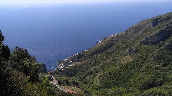 Ad un certo punto è possibile continuare lungo il sentiero alto, oppure prendere quello basso, che spesso corre lungo il ciglio di montagne a strapiombo sulle case del comune di Praiano e sulla strada costiera. Attenzione per chi soffre di vertigini! Si incontrano poi alcune case e, ancora in basso, è la Chiesa di S. Maria a Castro e l’annesso Convento di S. Domenico, mentre in alto si stende la tipica macchia mediterranea.