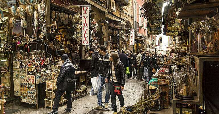 Potremmo continuare per ore perché il centro storico nasconde innumerevoli tesori d’arte. Ma è il momento di un po’ di tempo libero per lo shopping o per scoprire una delle tante pizzerie e gustare la vera pizza napoletana.